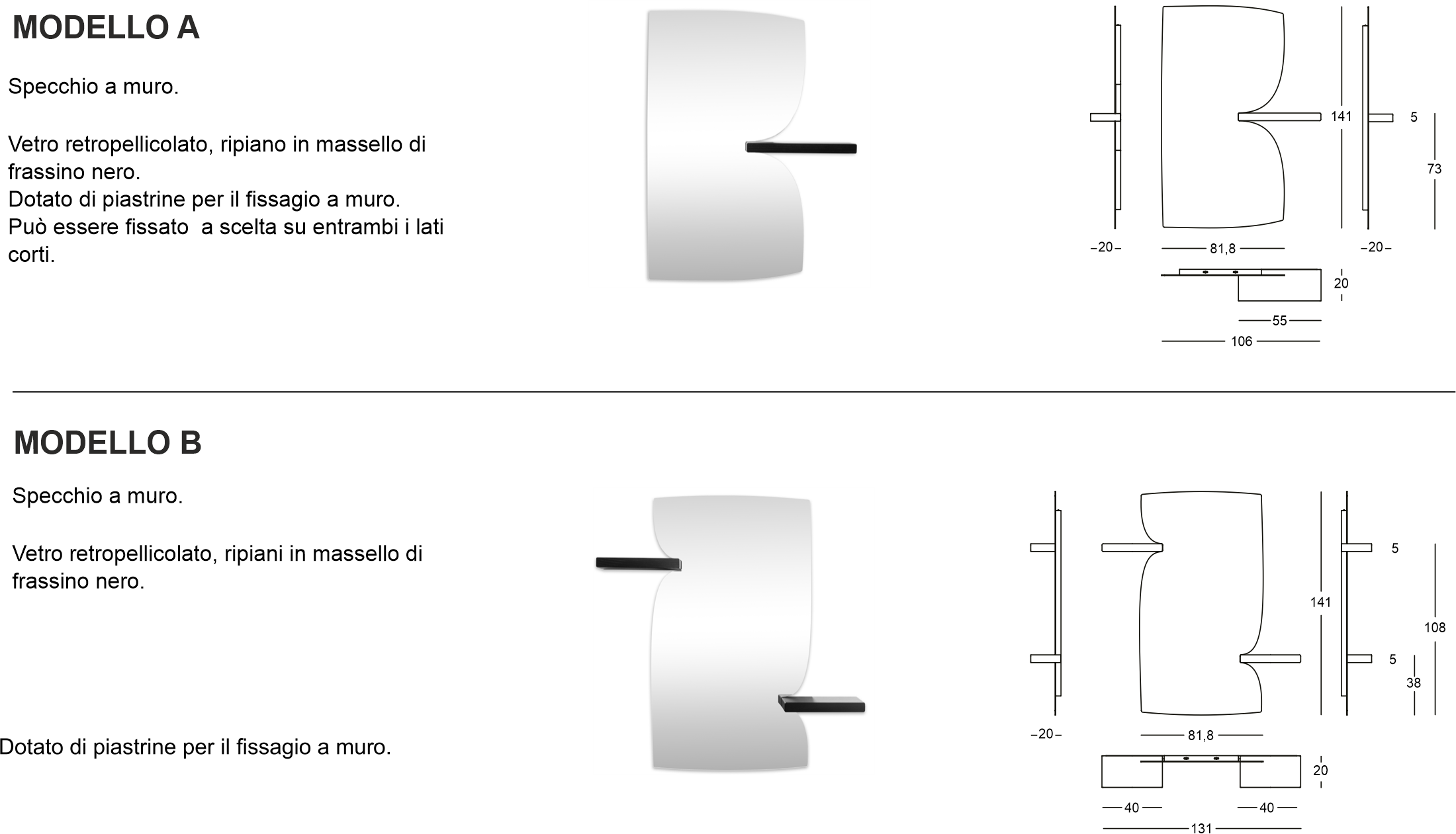 Materiali: mensole in massello di frassino nero. Vetro retropellicolato. Lo specchio con una sola mensola può essere fissato su entrambi i lati corti.