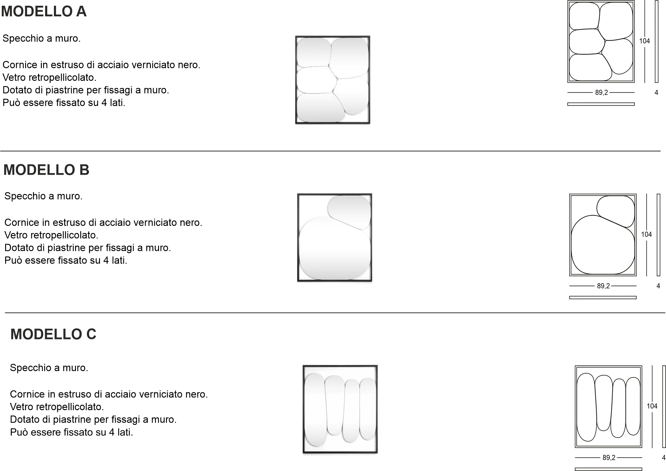 Materiali: cornice in estruso di acciaio verniciato. Vetro retropellicolato. Gli specchi possono essere fissati su tutti i 4 lati.