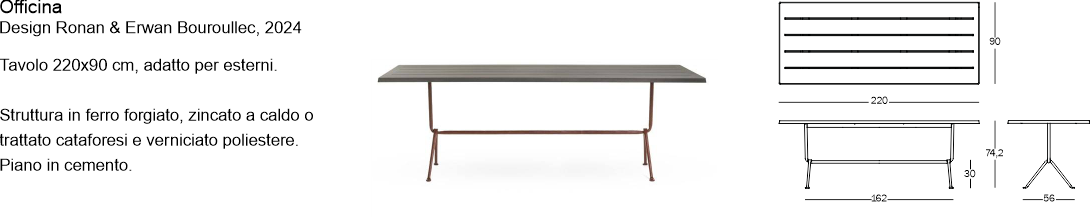 Materiali: struttura in ferro forgiato, zincato a caldo o trattato cataforesi e verniciato poliestere. Piano in cemento. Adatto per esterni.