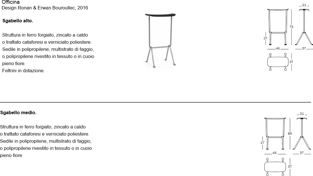 Materiali: struttura in ferro forgiato, zincato a caldo o trattato cataforesi e verniciato poliestere. Sedile in polipropilene, in polipropilene rivestito in cuoio primo fiore o in tessuto, in multistrato di faggio naturale o tinto.