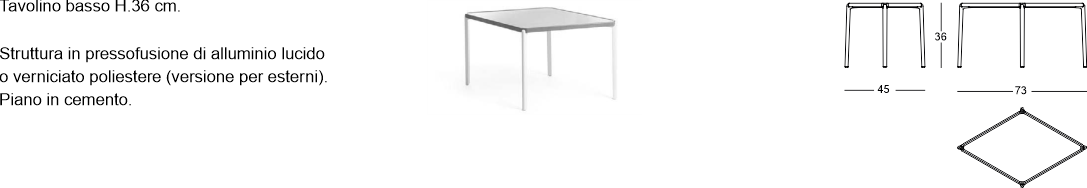 Materiali: struttura in pressofusione di alluminio lucido o in alluminio verniciato poliestere (versione per esterni). Piani in cemento verniciato a liquido, finitura lucida.