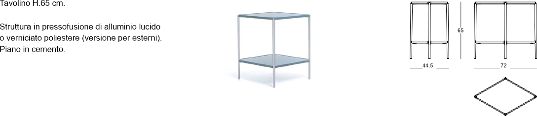 Materiali: struttura in pressofusione di alluminio lucido o in alluminio verniciato poliestere (versione per esterni). Piani in cemento verniciato a liquido, finitura lucida.