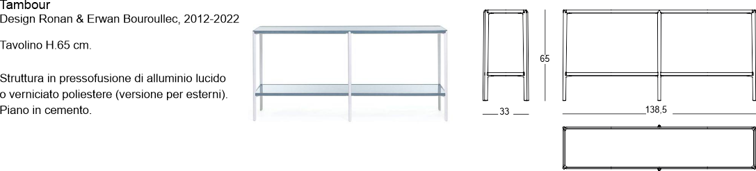 Materiali: struttura in pressofusione di alluminio lucido o in alluminio verniciato poliestere (versione per esterni). Piani in cemento verniciato a liquido, finitura lucida.