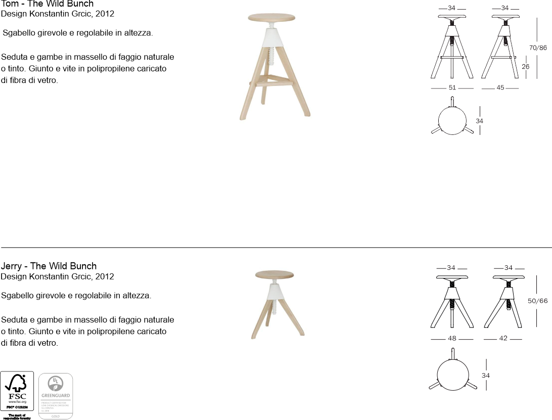 Materiali: seduta e gambe in massello di faggio naturale o tinto; giunto e vite in polipropilene caricato di fibra di vetro.
