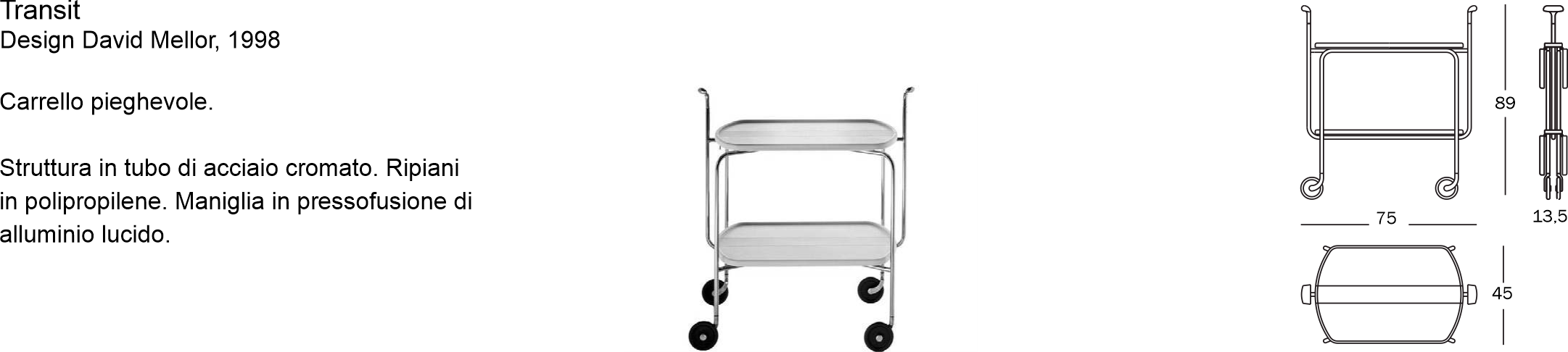 Materiali: struttura in tubo di acciaio cromato, ripiani in polipropilene, maniglia lucida in pressofusione di alluminio.