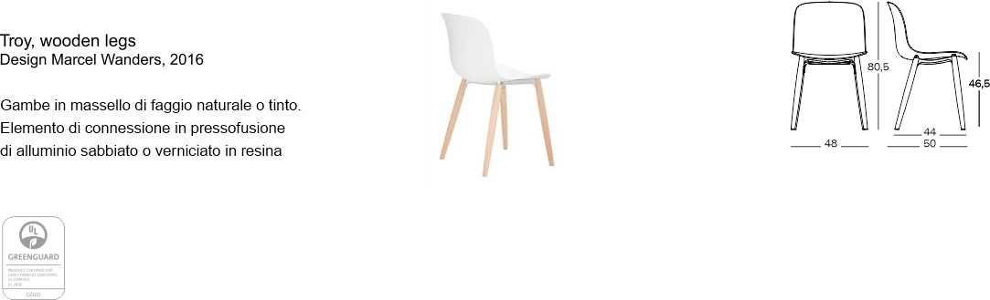 Materiali: gambe in massello di faggio naturale o tinto, sedile in polipropilene o in multistrato di faggio.
