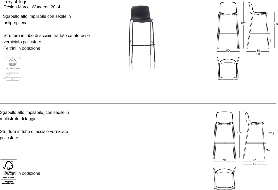 Materiali: struttura in tubo di acciaio trattato cataforesi e verniciato poliestere o in tubo di acciaio verniciato poliestere. Sedile in polipropilene o in multistrato di faggio;