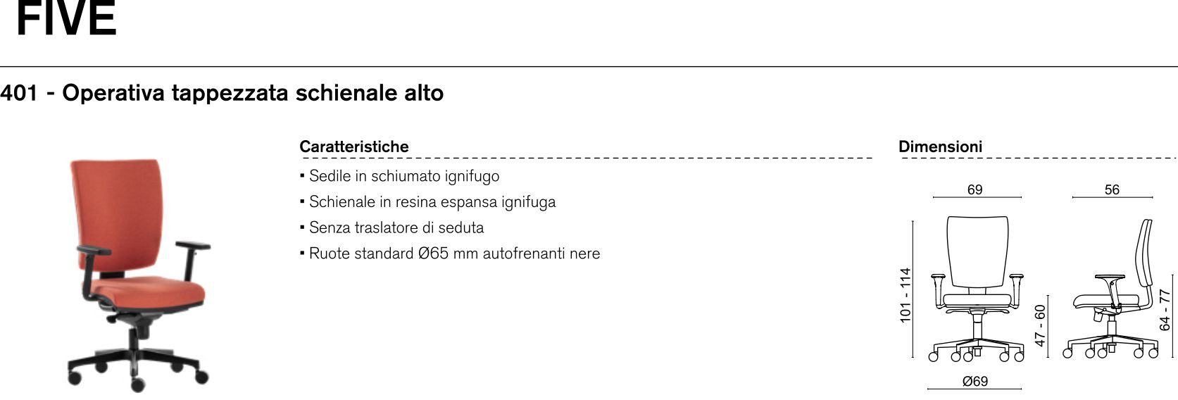 Five è una poltroncina operativa con meccanismo sincronizzato. Con schienale alto e braccioli regolabili in altezza, la base può essere in nylon o in alluminio lucido.