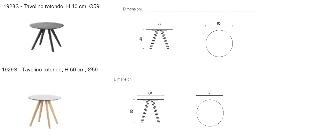 Le quattro gambe in frassino, proposte nelle finiture rovere, tabacco o nero, sostengono un piano rotondo in HPL, con diametro di 59 cm, disponibile nei colori bianco o nero.