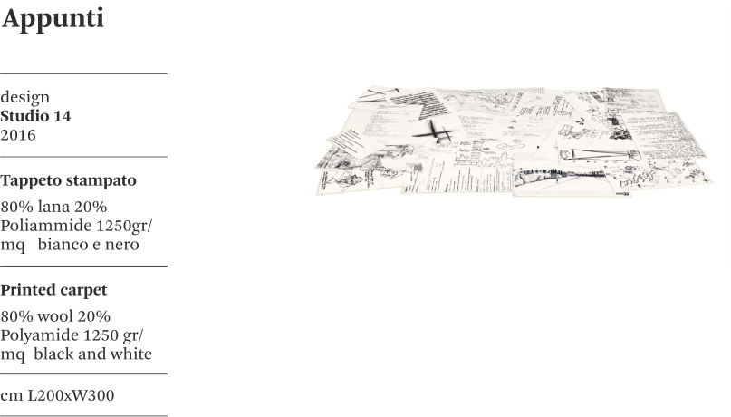 Appunti è un tappeto ideato da Studio 14 per Mogg, realizzato 80% lana e 20% poliammide.