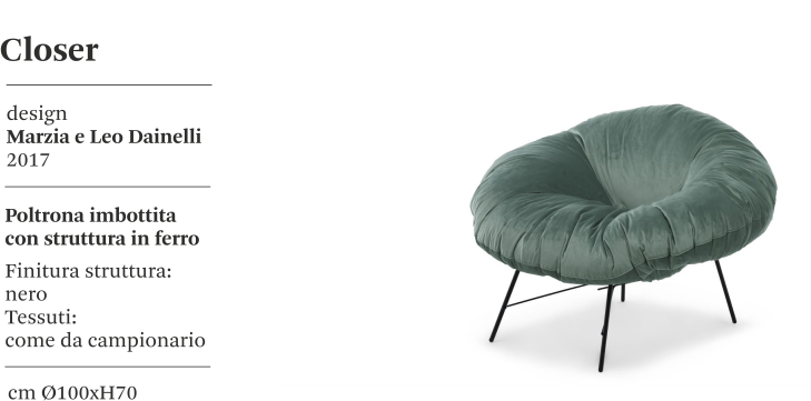 Closer è una poltrona rivestita progettata da Marzia e Leonardo Dainelli per il brand Mogg, con struttura in ferro verniciato nero opaco e cuscini della seduta in piuma supportata con rivestimento sfoderabile in velluto o panno. Un fusto in metallo esile ma solidissimo accoglie il cuscino dalle forme generose, leggero come una piuma. I colori e le texture dei tessuti contribuiscono all'originalità di Closer, nata da un'idea di "sofficità", evocata dai piumini ipertecnologici che oggi ci avvolgono negli inverni più freddi.
