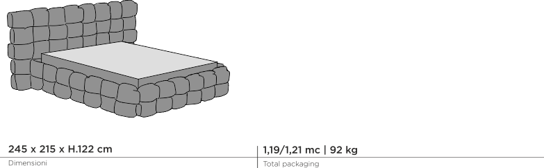 Letto matrimoniale che trasmette una piacevole sensazione di comfort grazie all’elegante macro intreccio imbottito dell’ampia testiera e del giroletto.Letto imbottito non sfoderabile, completo di rete a doghe in legno di faggio da cm 160x200