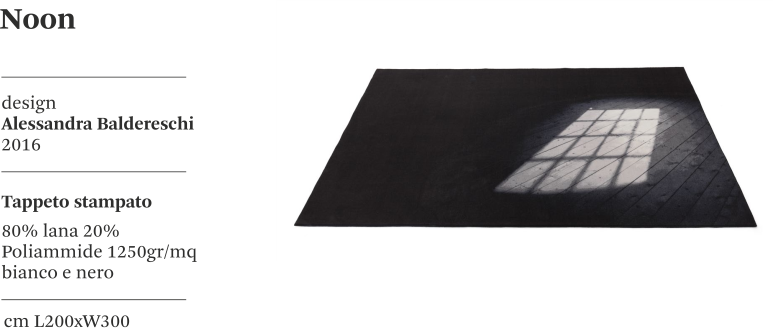 Noon, ideato dalla designer Alessandra Baldereschi per Mogg, è un tappeto stampato con bordo a filo, fatto all’80% di lana e al 20% di poliammide.