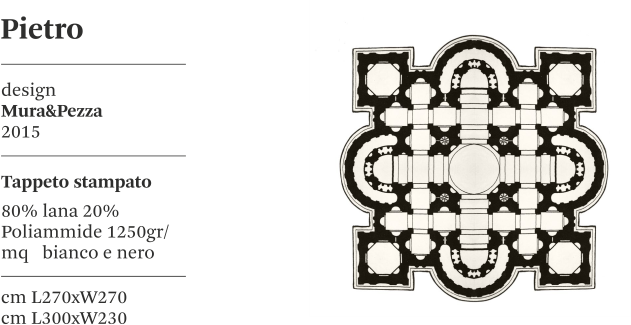 Pietro è un tappeto ideato da MuraEPezza per Mogg, realizzato 80% lana e 20% poliammide. Pietro è una coppia di tappeti di diversa dimensione, stampati in bianco e nero, con bordo a filo in lana nero e sotto tappeto accoppiato in feltro; la chiara ispirazione dei due designer nella realizzazione di questi tappeti risiede nella planimetria della famosa Basilica di San Pietro, una chiesa tardo-rinascimentale situata all'interno della Città del Vaticano.