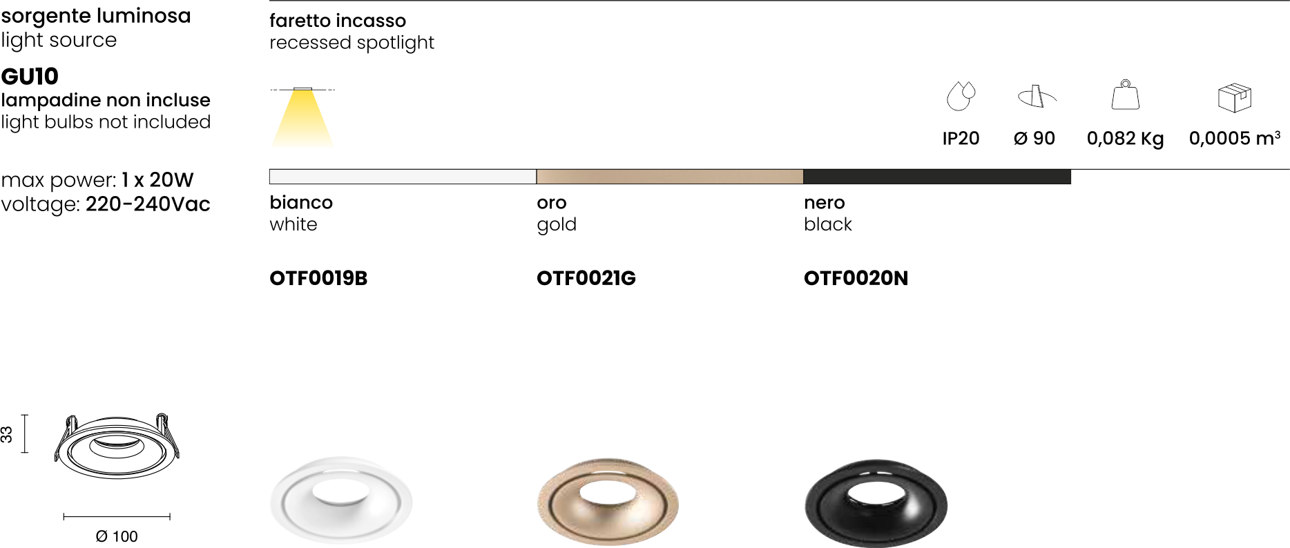Faretto GU10 ad incasso. Struttura in alluminio. Finitura in bianco opaco, nero opaco e oro.