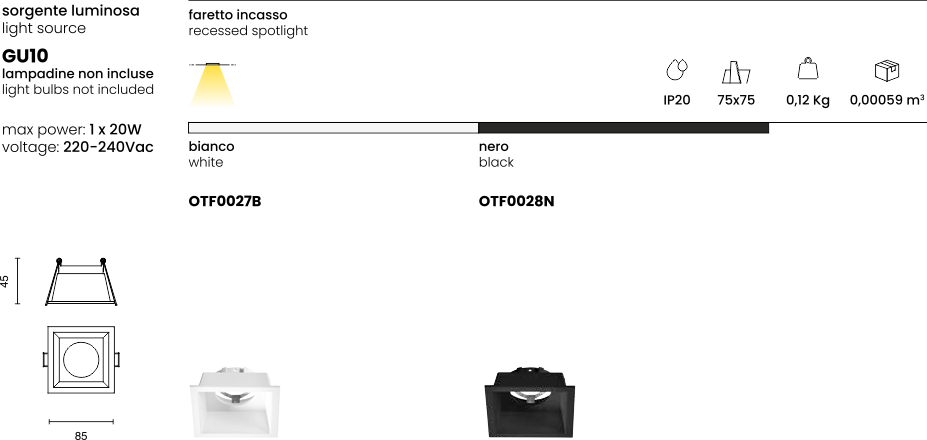 Faretto GU10 ad incasso, lampada rientrante. Struttura in alluminio. Finitura in bianco opaco e nero opaco.