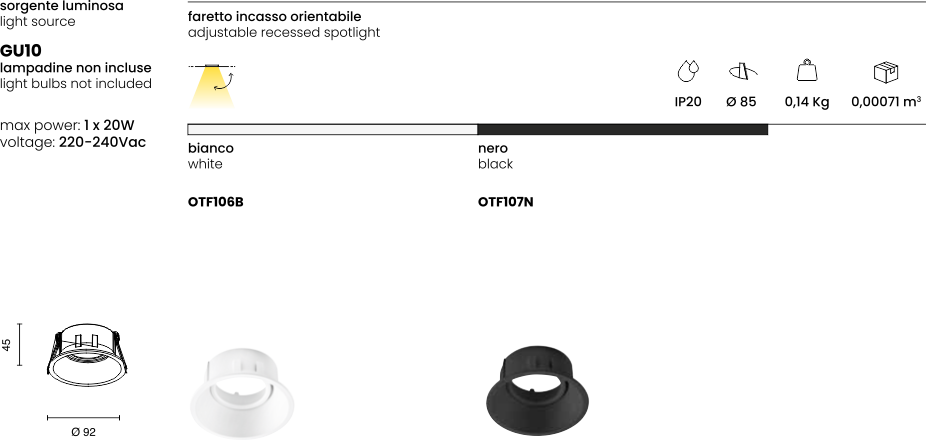 Faretto GU10 ad incasso, orientabile. Struttura in zinco. Finitura in bianco opaco e nero opaco. Lampada rientrante.
