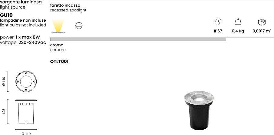 Faretto calpestabile da incasso, per esterni. Cover in acciaio inox 304, struttura in alluminio pressofuso. Involucro da interrare incluso.