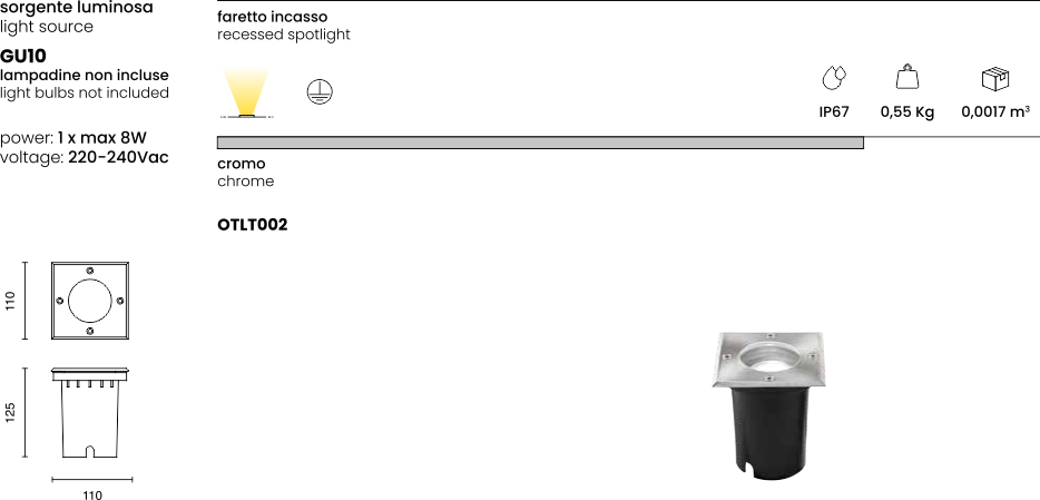 Faretto calpestabile da incasso, per esterni. Cover in acciaio inox 304, struttura in alluminio pressofuso. Involucro da interrare incluso.