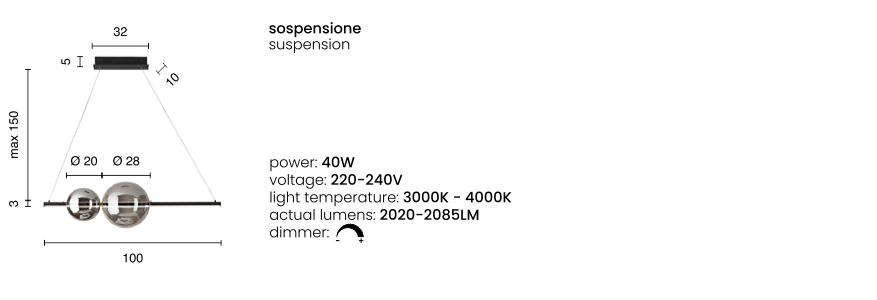 Sospensione a LED in metallo verniciato e vetro soffiato. Cavetti regolabili in lunghezza.