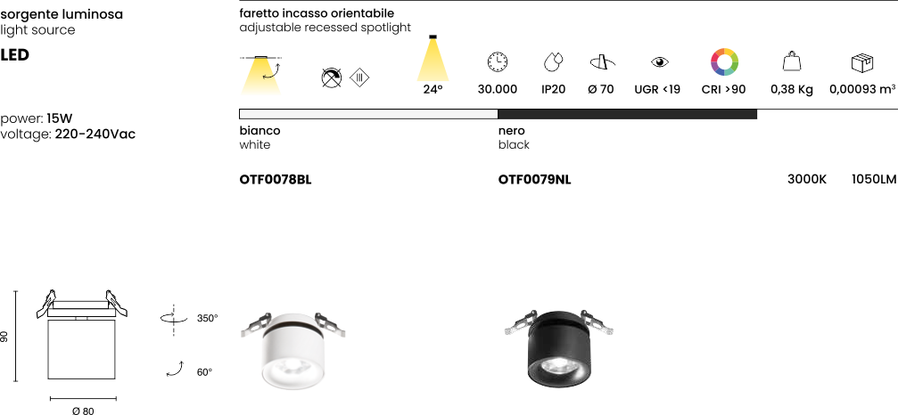 Faretto LED ad incasso, orientabile. Struttura in alluminio. Finitura in bianco opaco e nero opaco. Diffusore rientrante in policarbonato. Driver incluso. COB Bridgelux.