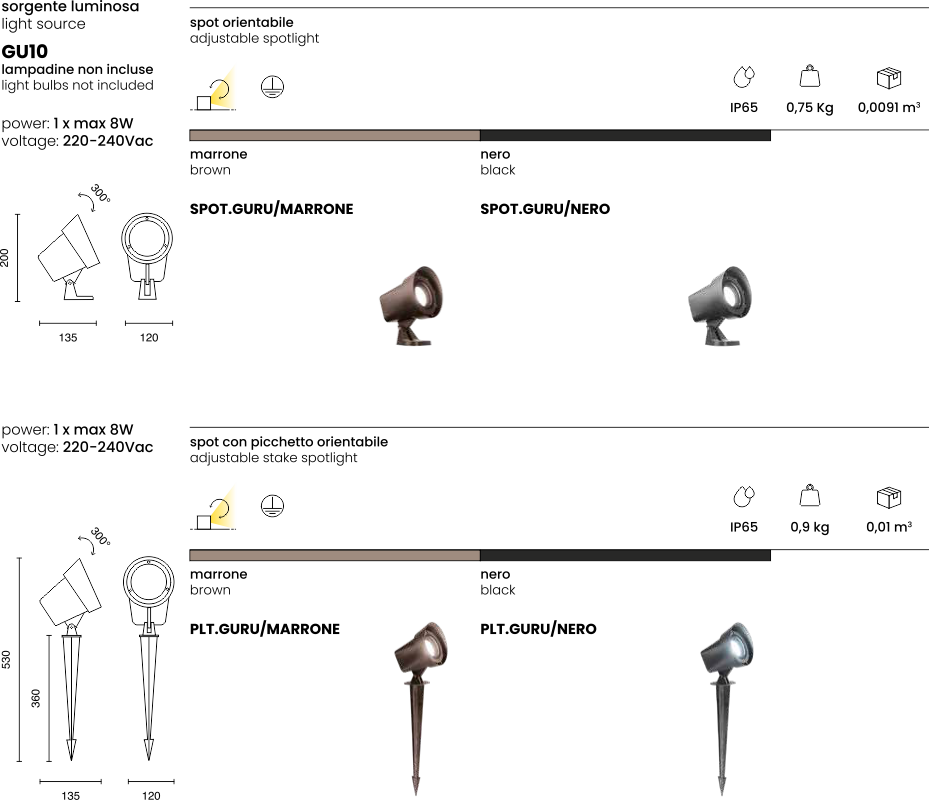 Spot per esterni, a pavimento o a picchetto, struttura in alluminio, diffusore in vetro, deflettore frontale in plastica.