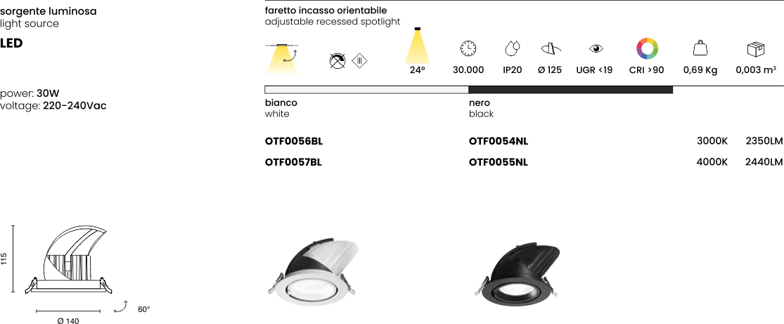 Faretto LED ad incasso, orientabile. Struttura in alluminio. Finitura in bianco opaco e nero opaco. Diffusore in policarbonato. Driver incluso. COB Bridgelux.