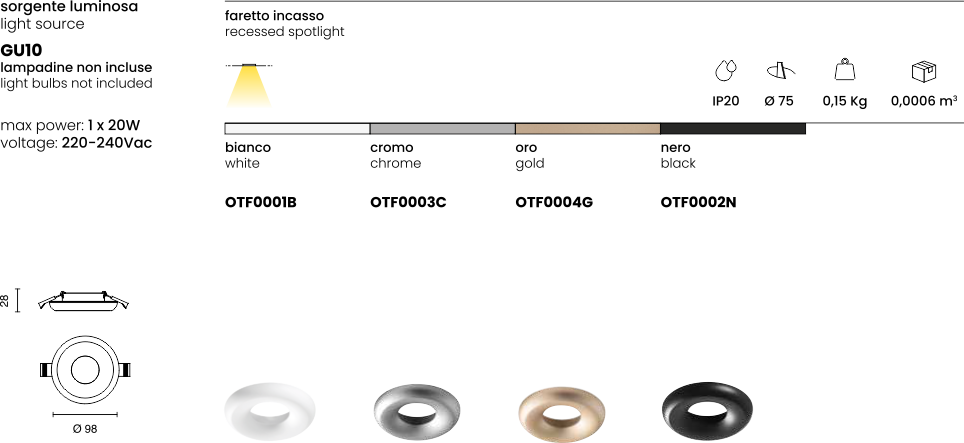 Faretto GU10 ad incasso. Struttura in alluminio. Finitura in bianco opaco, nero opaco, oro e cromo.