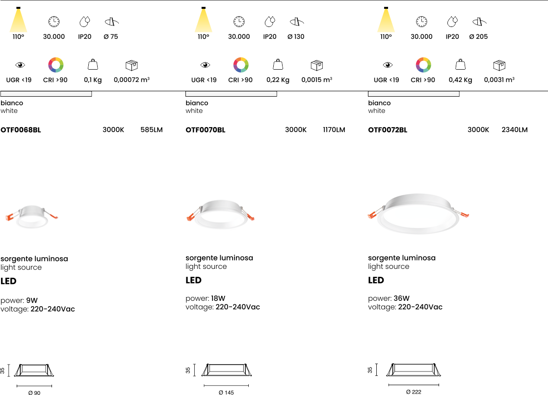 Faretto LED da incasso. Struttura in alluminio, diffusore in policarbonato. Driver incluso.