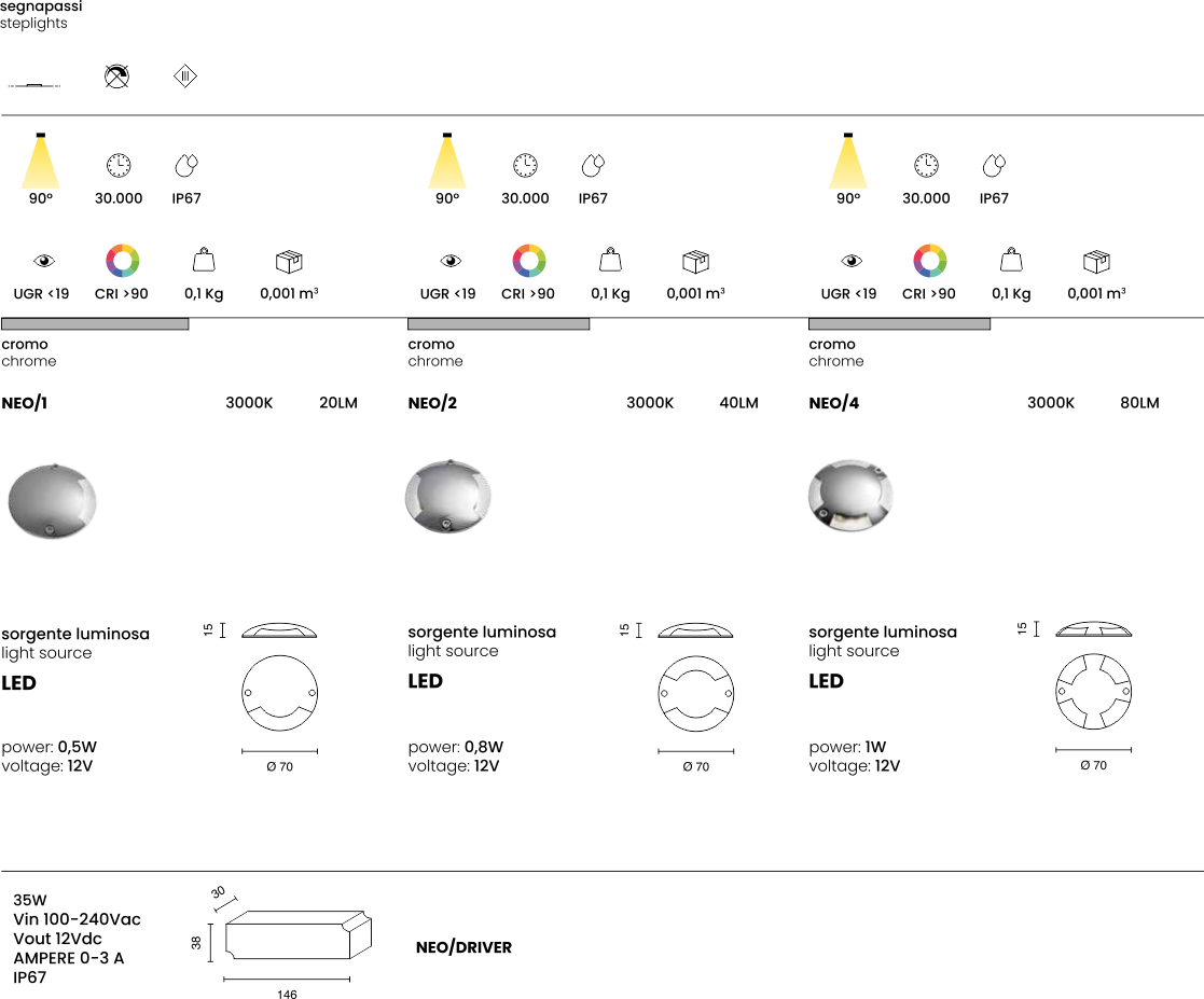 Faretto segnapasso a LED per esterni, struttura in alluminio cromato. Disponibile in tre emissioni di luce. Driver incluso.