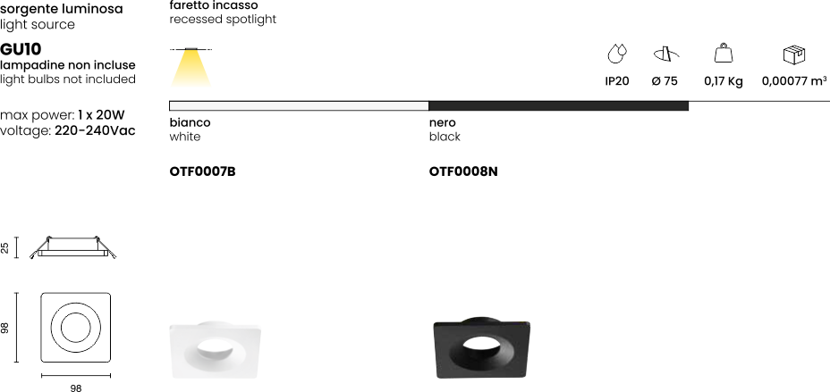 Faretto GU10 ad incasso. Struttura in alluminio. Finitura in bianco opaco e nero opaco.