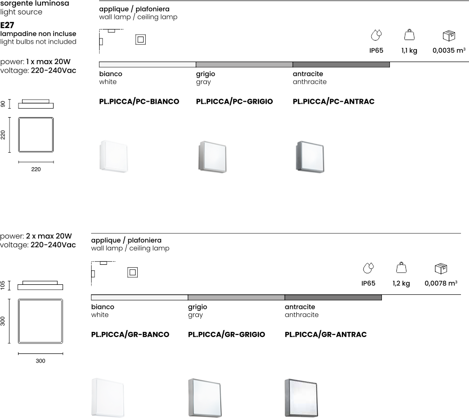 Plafoniera o applique per esterni, struttura in ABS e diffusore in policarbonato. Disponibile in tre colori