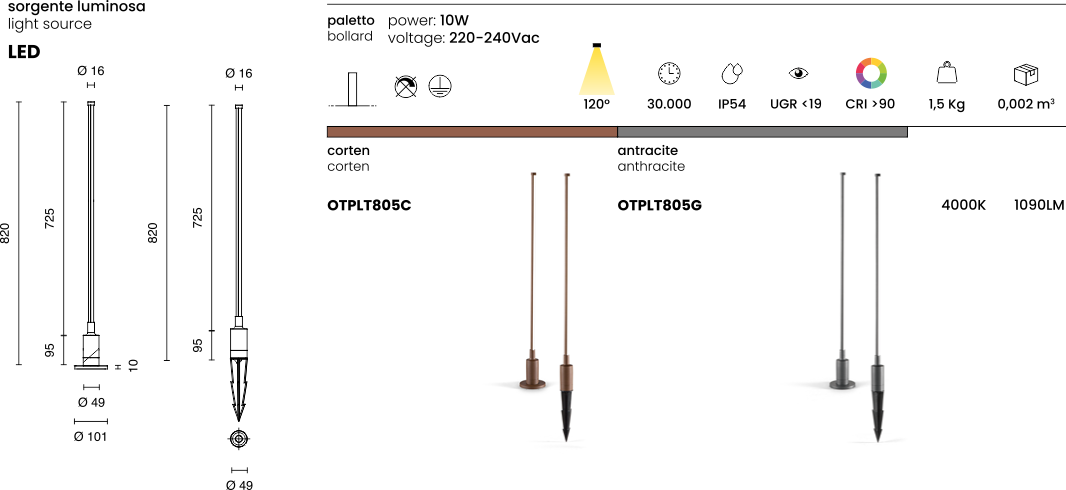 Paletto LED in alluminio con diffusore in policarbonato. Incluse due basi di ancoraggio: con picchetto e con base piatta. Driver incluso.