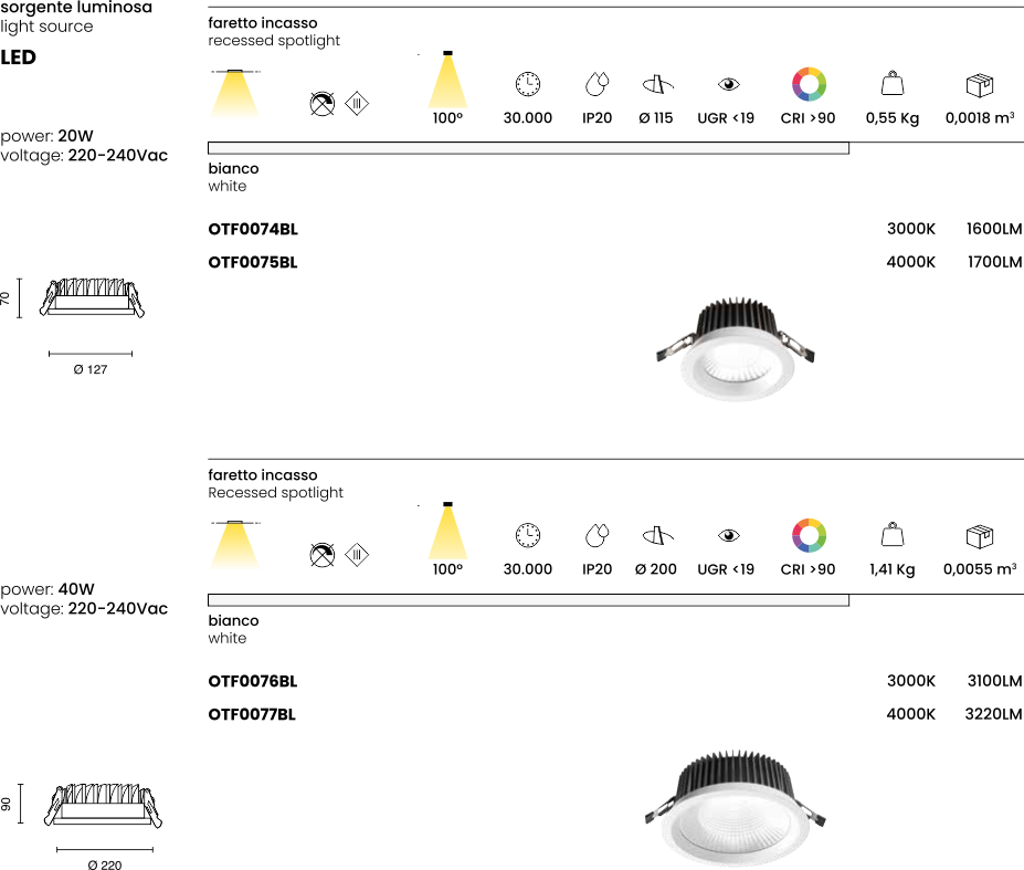 Faretto LED ad incasso. Struttura in alluminio. Diffusore in policarbonato. Finitura in bianco opaco. Ottica rientrante. Driver incluso. COB Bridgelux.