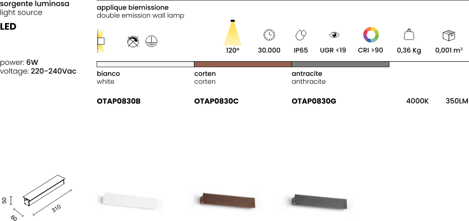 Applique LED da esterni a doppia emissione. Struttura in alluminio e diffusore in policarbonato. Driver incluso.