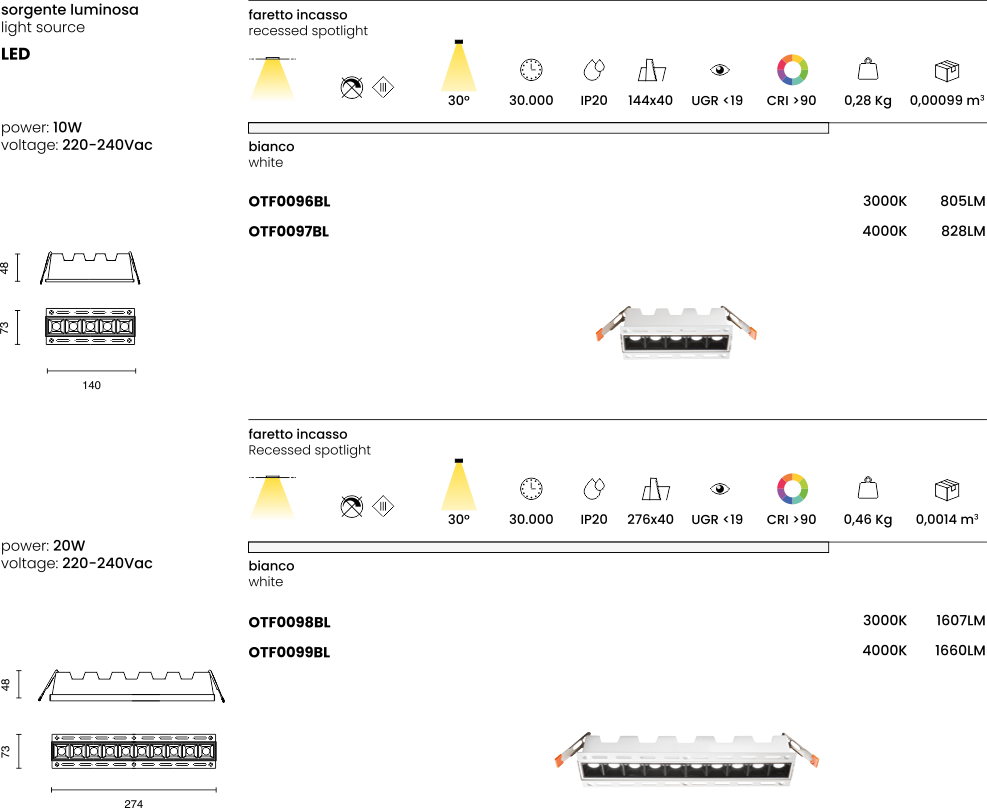 Faretto ad incasso, a filo. Versione a 5 o 10 COB. Struttura in alluminio. Diffusore in policarbonato con ottica antiabbaglio. Mascherina antiabbaglio nera. Driver incluso. LED Osram.