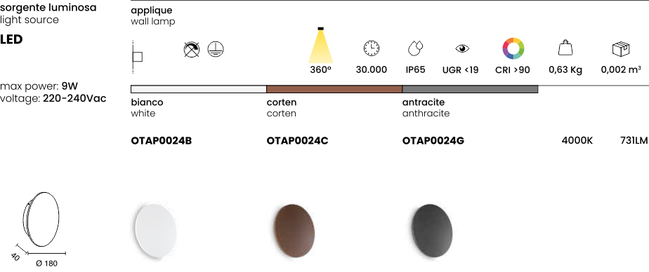 Applique LED da esterni. Struttura in alluminio. Diffusore in policarbonato. Driver incluso.
