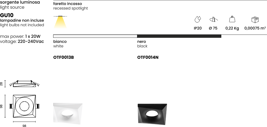 Faretto GU10 ad incasso. Struttura in alluminio. Finitura in bianco opaco e nero opaco.