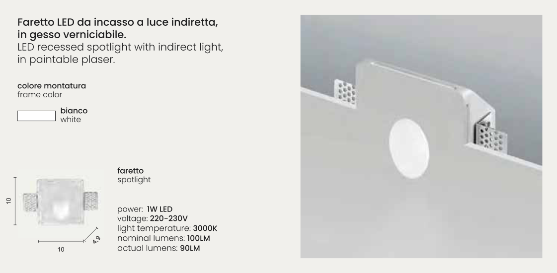 Faretto LED da incasso a luce indiretta, in gesso verniciabile.