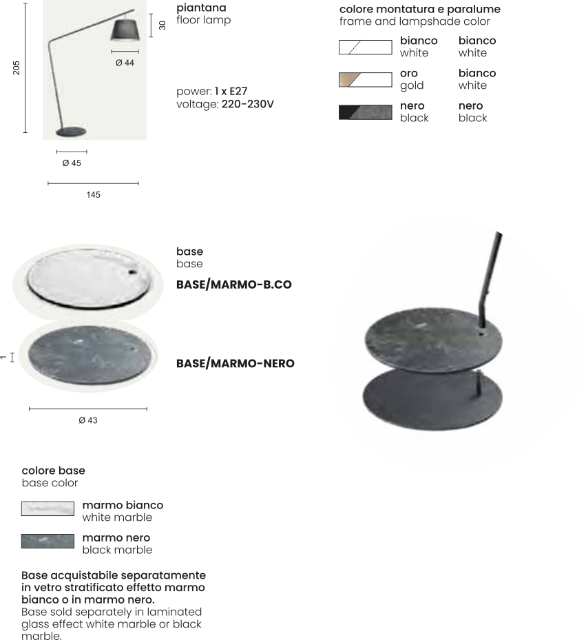 Piantana con struttura in metallo e paralume in PVC rivestito in tessuto. Personalizzabile con cover per base effetto marmo, da acquistare separatamente.