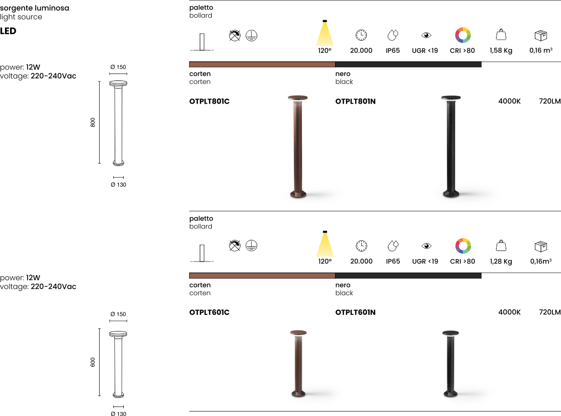 Paletto LED in alluminio con diffusore in policarbonato. Driver incluso.