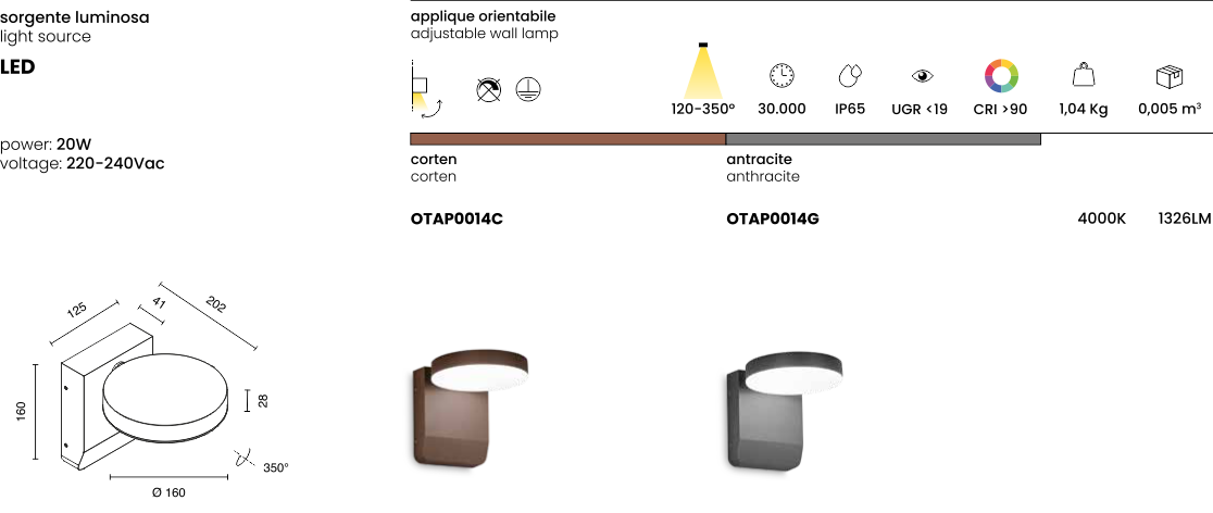 Applique LED da esterni, orientabile. Struttura in alluminio. Diffusore in policarbonato. Driver incluso.