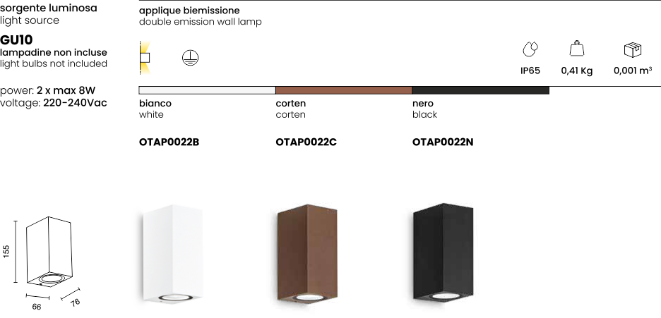 Applique GU10 per esterni. Struttura in alluminio e diffusore in vetro.