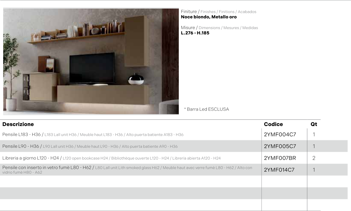 Funzionalità, design e stile contemporaneo si incontrano in questa parete attrezzata dal carattere deciso e raffinato. Pensata per ambienti moderni e luminosi, questa composizione unisce la calda finitura Noce Biondo alla sofisticata texture Metallo Oro, dando vita a un arredo elegante ma pratico.