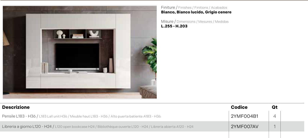 Eleganza e semplicità si incontrano in questa parete attrezzata dal design moderno, perfetta per ambienti luminosi e raffinati. Le finiture in Bianco lucido e Grigio cenere creano un contrasto sofisticato, capace di valorizzare qualsiasi soggiorno con uno stile pulito e contemporaneo.