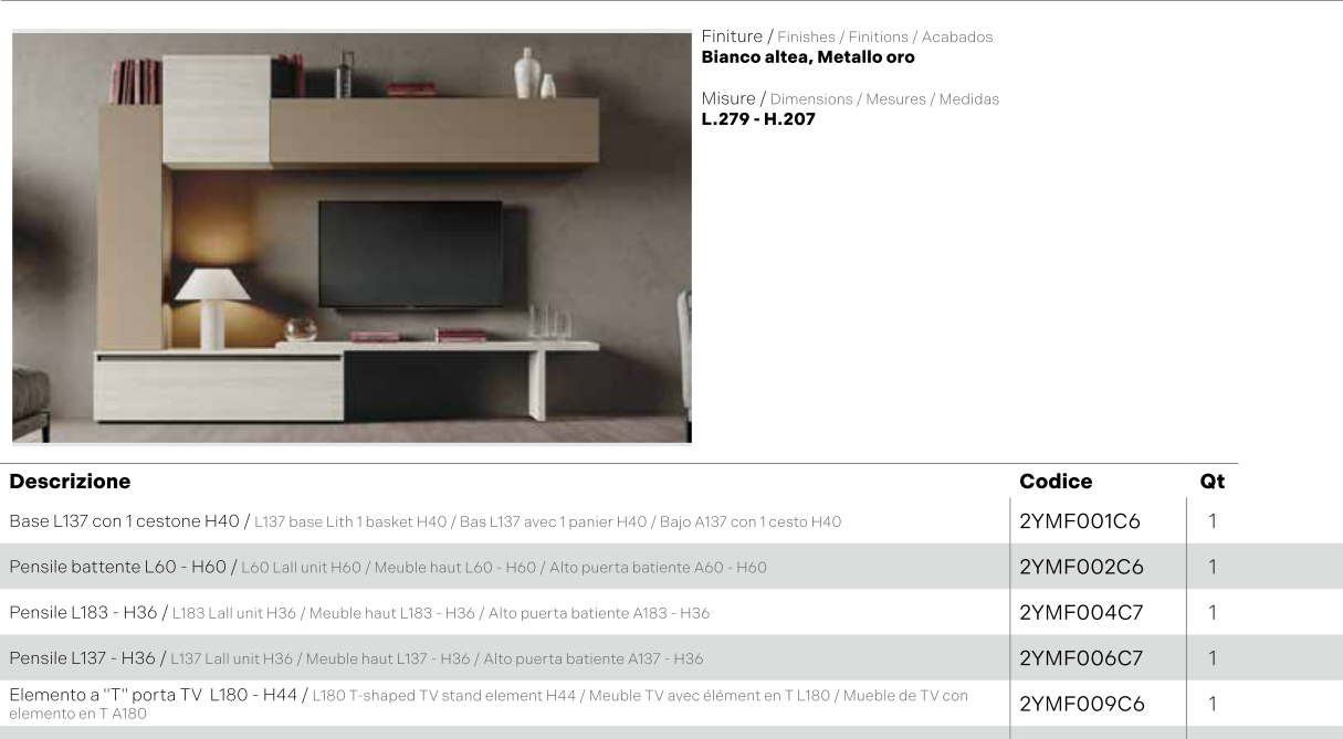 Dona carattere e ordine alla zona living con questa parete attrezzata dallo stile moderno, valorizzata dalla combinazione sofisticata di Bianco Altea e Metallo Oro. La struttura geometrica, sobria ed equilibrata, alterna elementi chiusi e volumi aperti, offrendo una soluzione perfetta per chi cerca estetica e praticità in un unico arredo.
