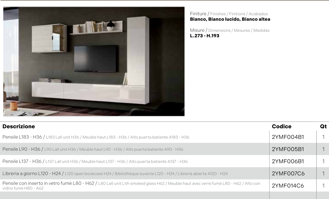 Un mix perfetto di eleganza e funzionalità: questa parete attrezzata moderna è pensata per arredare il soggiorno con stile e ordine. Le finiture in Bianco, Bianco Lucido e Bianco Altea donano luminosità e raffinatezza, ideali per ambienti contemporanei ed essenziali.