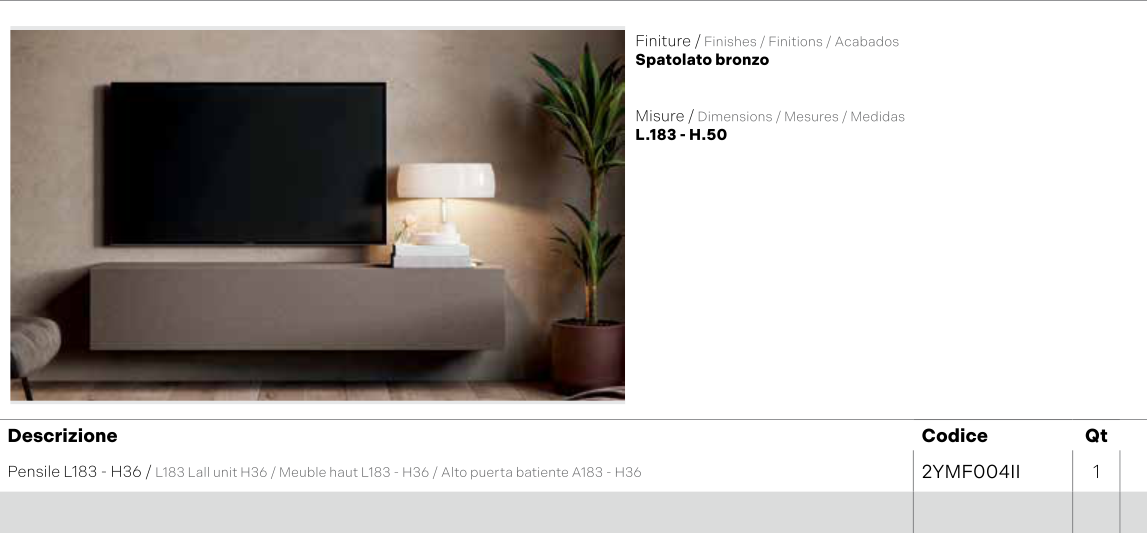 - Pensile L183 cm H36 cm Ampio modulo con anta battente, perfetto per contenere dispositivi multimediali, libri o oggetti di uso quotidiano mantenendo lo spazio pulito e ordinato.