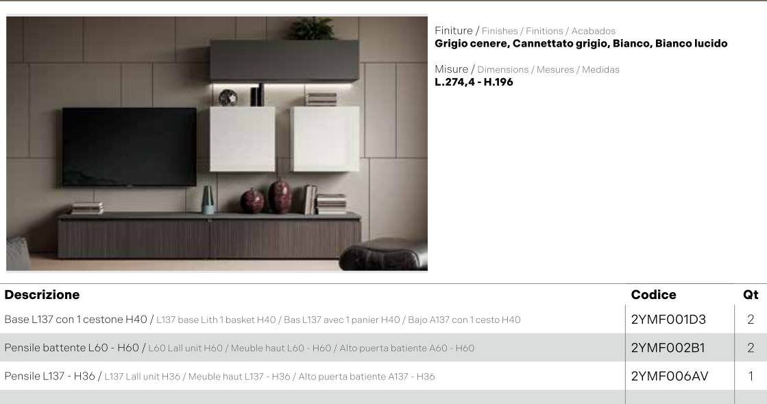 Una composizione living compatta e contemporanea che fonde eleganza moderna e massima funzionalità. Caratterizzata da finiture raffinate in Grigio cenere, Bianco lucido e Cannettato grigio, questa parete attrezzata offre un design essenziale e geometrico, perfetto per ambienti sofisticati e ben organizzati.