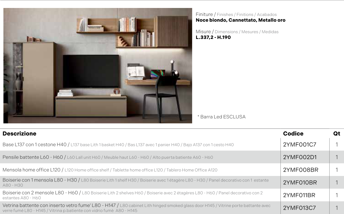 Una parete attrezzata dal design contemporaneo e funzionale, perfetta per chi desidera un living completo con spazio dedicato anche allo smart working. Le finiture in Noce Biondo, Cannettato e Metallo oro donano calore, eleganza e carattere all’ambiente.